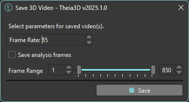 Save the 3D scene as an AVI video file. The video saved is identical to the 3D view shown in the 3D Viewer; therefore you should modify the options that affect the 3D visualizations in the [Display Menu](https://docs.theiamarkerless.com/theia3d-documentation/theia3d-dropdown-menus/display-menu) and [Settings Menu ](https://docs.theiamarkerless.com/theia3d-documentation/theia3d-dropdown-menus/settings-menu)before saving before saving 3D View videos. Select the desired frame rate and the frame range of the videos and press the ***Save*** button. Browse to the desired save location and enter the desired *filename*.