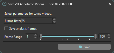 Save each of the 2D view video overlays as an AVI file. The videos saved are identical to the overlays shown in Theia3D; therefore, you should modify the options that affect the 2D visualizations in the [Display Menu](https://docs.theiamarkerless.com/theia3d-documentation/theia3d-dropdown-menus/display-menu) and [Settings Menu ](https://docs.theiamarkerless.com/theia3d-documentation/theia3d-dropdown-menus/settings-menu)before saving video overlays. Select the desired frame rate and the frame range (or select the option to use the analysis frames) of the videos and click the ***Save*** button. Browse to the desired save location and enter the desired *filename*. One video file will be saved for each overlay and the files are automatically named as *filename\_cameraID.avi*.