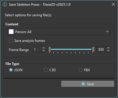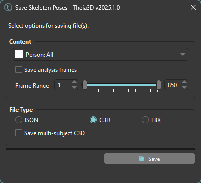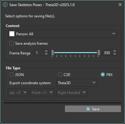 Save the 3D pose of the tracked people. Select the person (or all people) and the frame range (or select the option to use the analysis frames) to save in the file. Files can be saved in C3D, FBX, or JSON format. The data included in the files is described in[ ](https://docs.theiamarkerless.com/theia3d-documentation/theia-model-description)[Model Reference](https://docs.theiamarkerless.com/theia3d-documentation/theia-model-description).