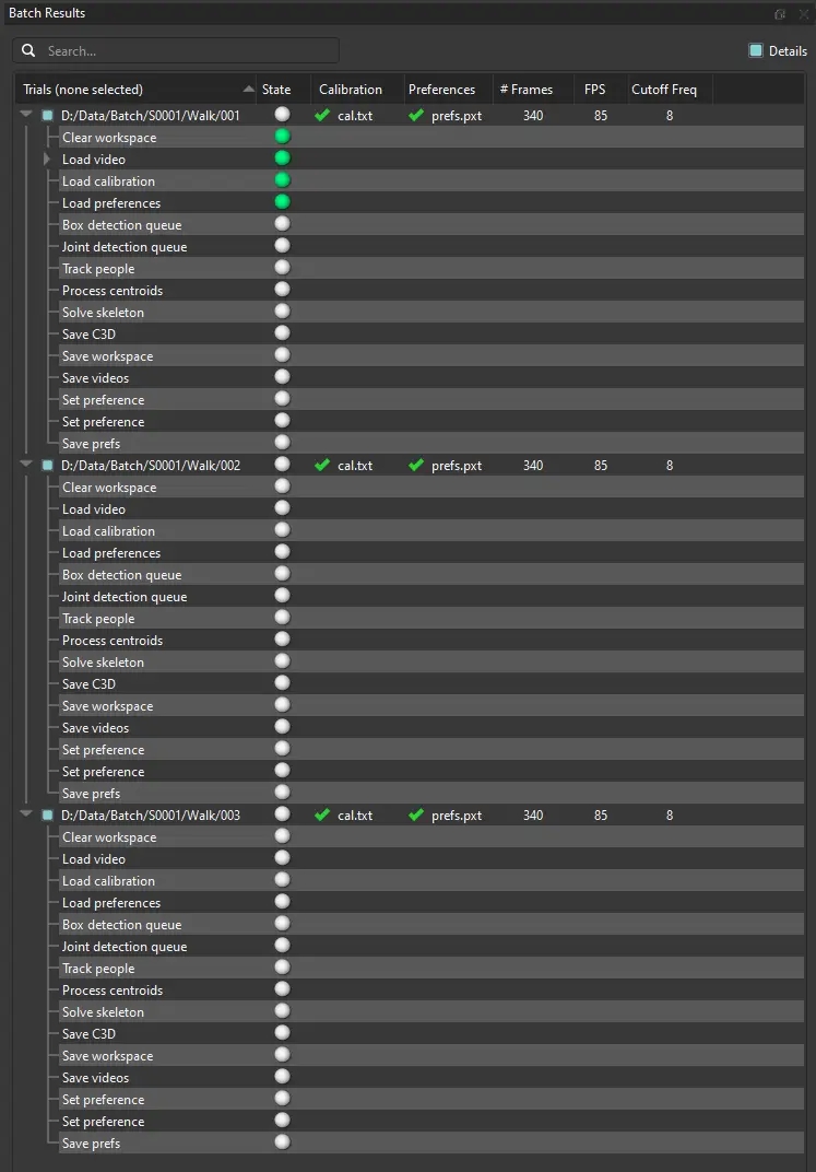 The batch progress dialog displays the progress of the currently running batch analysis. Each trial in the batch is shown and can be expanded to show the separate analysis steps. State icons (circles) are shown, and correspond to the same states as described in Trials.