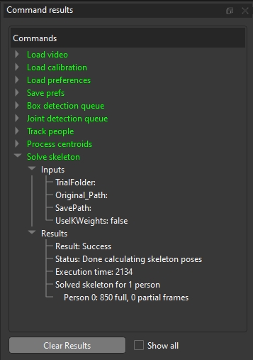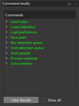 The view command results window shows the commands that have completed by Theia3D while handling and processing data, including specific inputs and outputs in the dropdown menus when expanded. The text color indicates the step status, where green indicates success and yellow indicates a warning is present.