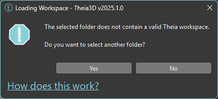 This error message arises when attempting to load a saved Theia3D workspace. It indicates that the trial folder selected when browsing to load a workspace is missing required files, such as video or T3D  files.