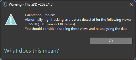 This error message arises when abnormally high tracking errors are detected for one or more camera views, as reported in the error dialog. As indicated by the dialog, this usually indicates a problem with the camera calibration and may be possible to resolve using the [Check Calibration](https://docs.theiamarkerless.com/theia3d-documentation/theia3d-dropdown-menus/calibration-menu/check-calibration) tool.