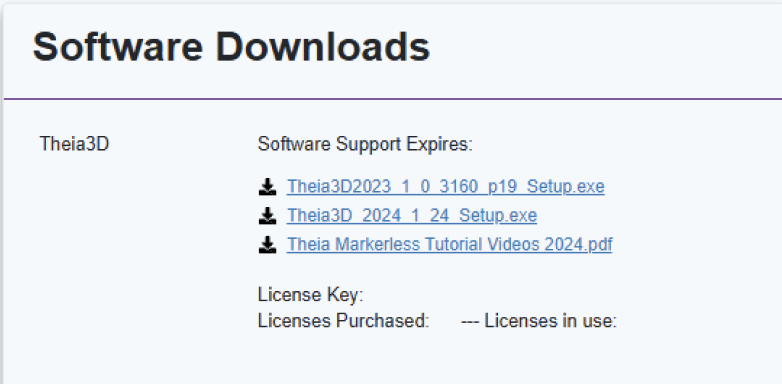 <figure><img src="https://content.gitbook.com/content/5NTeqxfMEXoI7Qj5TlH5/blobs/otwZWZn4KRXSbyjzclGC/image.png" alt="" width="563"><figcaption><p>Theia3D installer downloads and license details.</p></figcaption></figure>