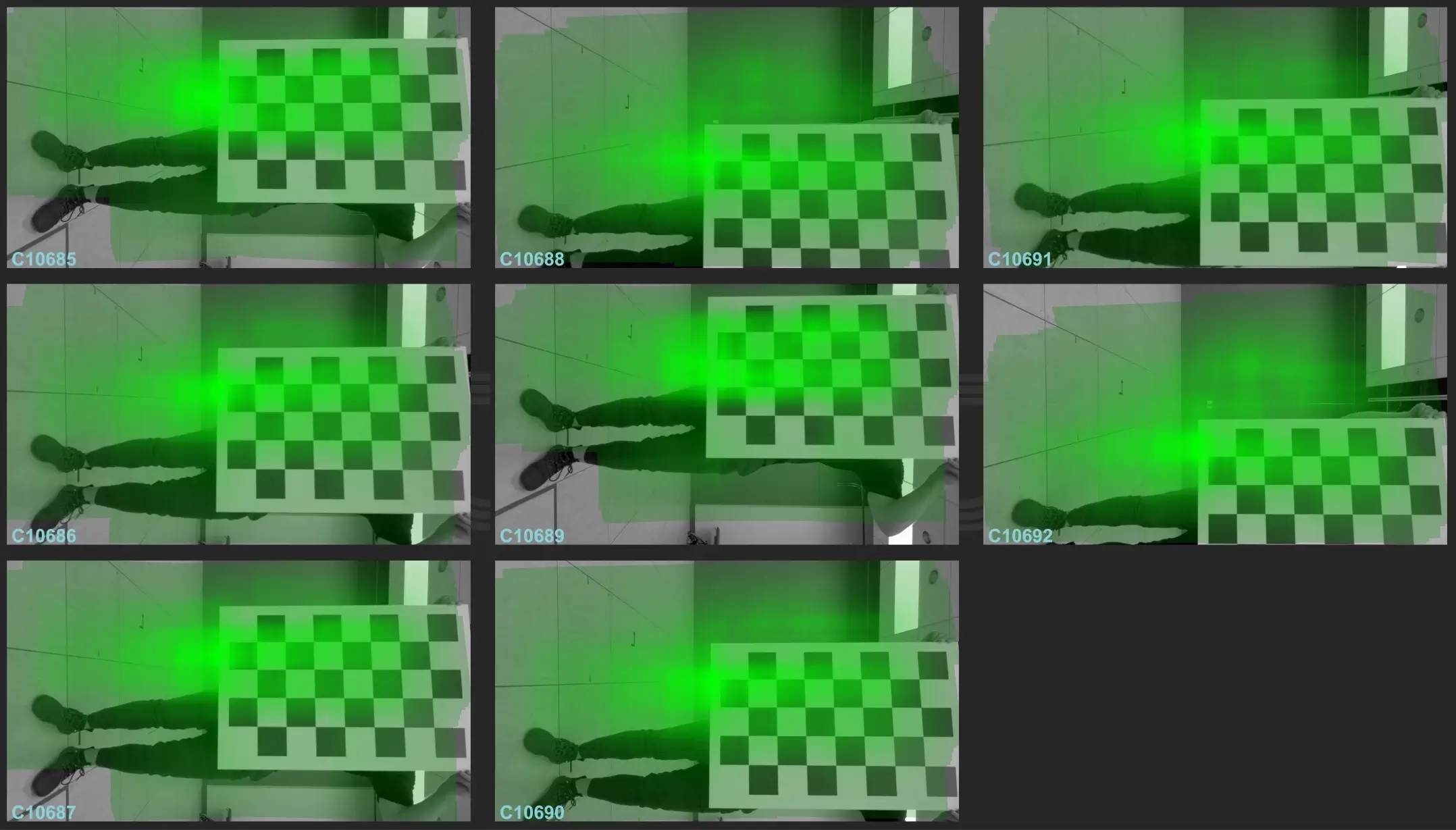 After acknowledging the lens calibration results dialog window, the camera views will be updated to visualize the results of the lens calibration process. The green shading is a heatmap of the detected chessboard across the camera view, where the green area indicates the portion of the view that was covered during the calibration and the intensity of the green area indicates the number of frames in which the chessboard was detected while covering that part of the view.